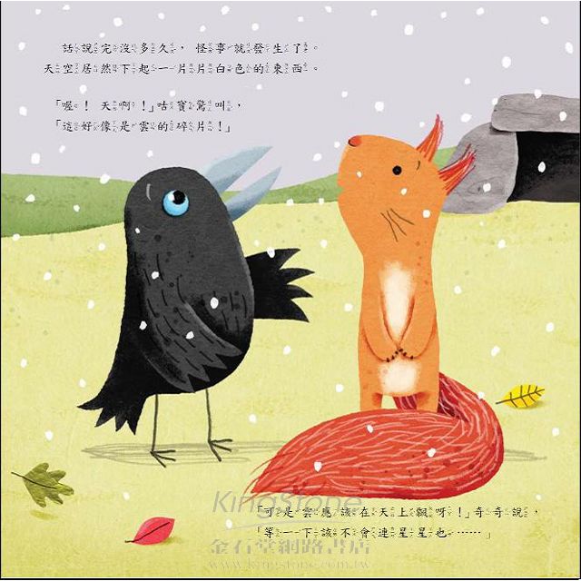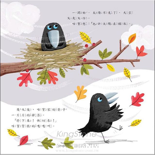 隨著全球暖化、氣候變遷,越來越多的災難電影占據各大票房,我們有時不禁會想:如果有一天世界都改變,你希望誰在你身邊?當然,本書不是關於末日或災難的繪本,它是一個可愛的故事,講述主角小烏鴉咕寶從來沒有遇過冬天,當他發現太陽起得越來越晚、河水變玻璃、雲變成碎片掉下來……這些他從沒遇過的事,讓他感到好害怕,尤其是他的朋友都不見了,那種心中的恐懼可想而知。人生中,我們總是會有沮喪或害怕的時候,如果這時候沒有人陪在身邊,該有多無助?我們常常逞強的笑說沒事,可是其實更想要一個緊緊的擁抱,告訴我們:「沒關係、別害怕。」而正是因為這個適時的鼓勵,讓我們在受傷的時候不害怕、在寂寞的時候更勇敢。就像奇奇送給咕寶的大驚喜,即使有一天咕寶成了老烏鴉,他也永遠不會忘記這一刻的感動。本書不只帶給我們歡笑和溫暖,也讓孩子體認「陪伴」與「付出」的重要性,更珍惜每一段情誼。