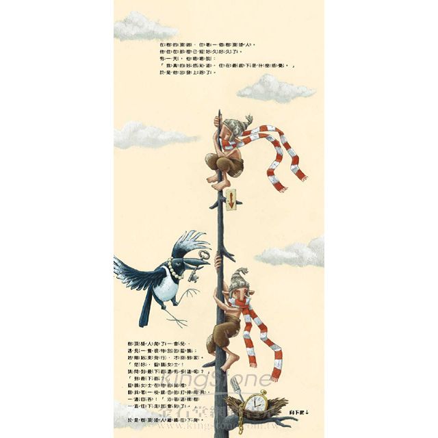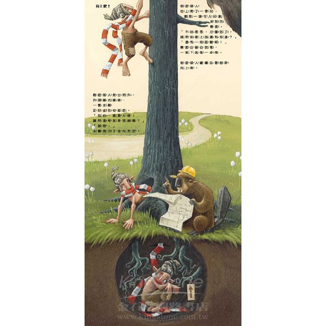 在樹底的洞穴裡,住著一個小矮人。他住在這裡已經很久很久了。有一天,他說:「我真的好想知道,住在頂端是什麼感覺。」