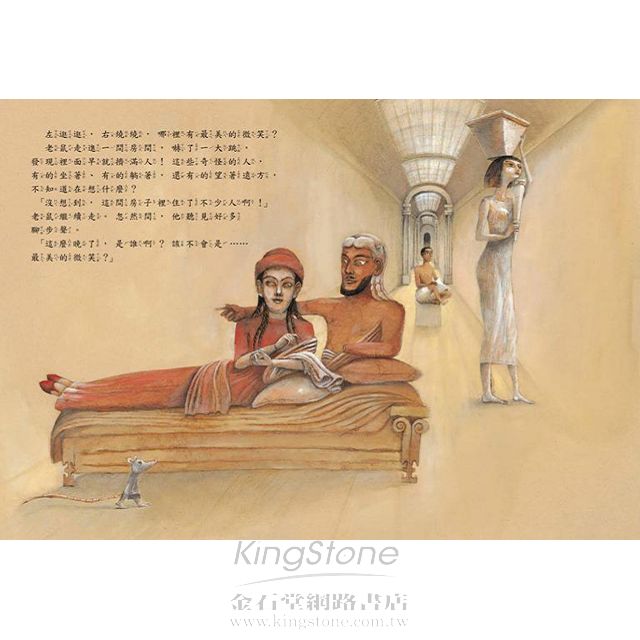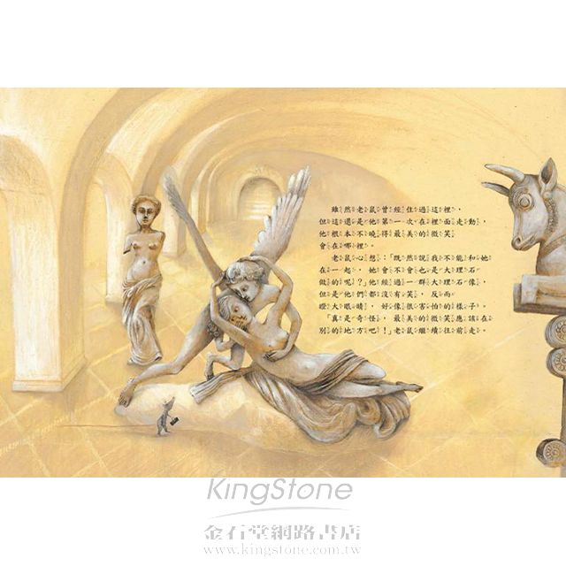 故事藉由一隻大理石老鼠,介紹羅浮宮的收藏品。比起條列式的百科全書,這本繪本式的呈現方法,顯然活潑許多。書中的主角小老鼠,在經過一次又一次的摸索、詢問,終於找到了最美的微笑。