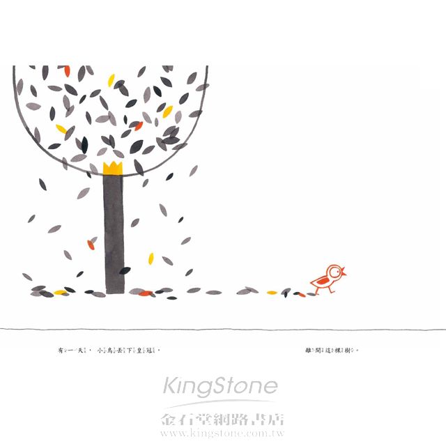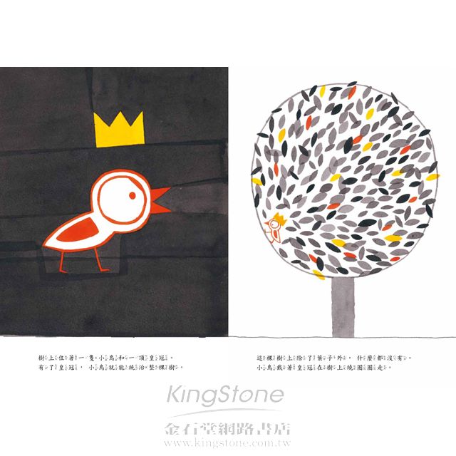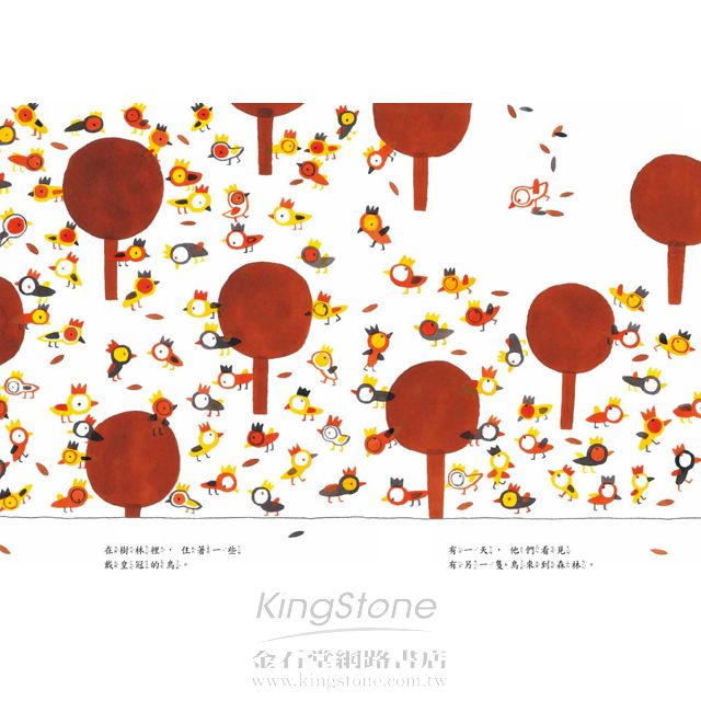 本書封面有許許多多可愛的鳥兒,仔細一看,會發現只有一隻鳥戴著皇冠,繪者艾莉莎葛茵藉著畫面的巧妙安排,點出了故事的主角,並隱隱透露出尋找自我的意涵。故事一開始,描繪著一棵樹,在這棵樹上面,住著一隻戴皇冠的鳥,雖然他統治了整棵樹,可是這裡只有他,小鳥感到好寂寞。有時候,我們會發現,即使自己有再高的成就和榮譽,可是沒有人分享,會很寂寞。