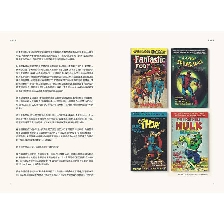 1974 年,當「漫威之父」史丹‧李親手編選出這些故事時,他並不是在懷舊,而是在定義一個全新的神話宇宙。《漫威起源》收錄了五位經典英雄——蜘蛛人、驚奇四超人、浩克、雷神索爾與奇異博士——的原始登場篇章,每一則故事都是時代的起點、每一頁都承載著超級英雄概念誕生的瞬間。