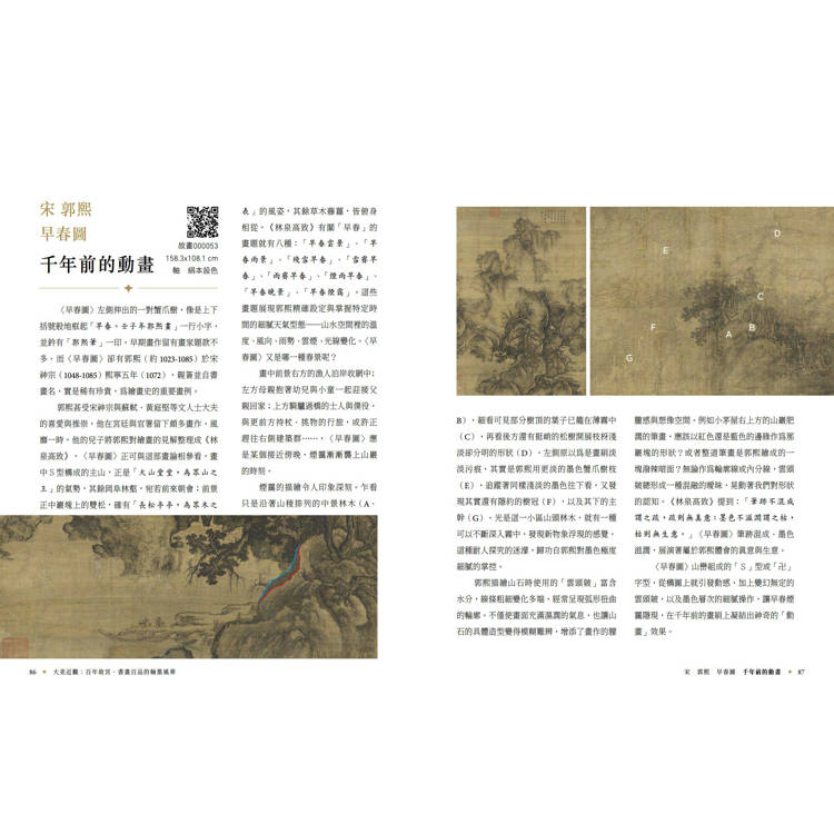 〈早春圖〉山巒組成的「S」型或「卍」字型,從構圖上就引發動感,加上變幻無定的雲頭皴,以及墨色層次的細膩操作,讓早春煙靄隱現,在千年前的畫絹上凝結出神奇的「動畫」效果。