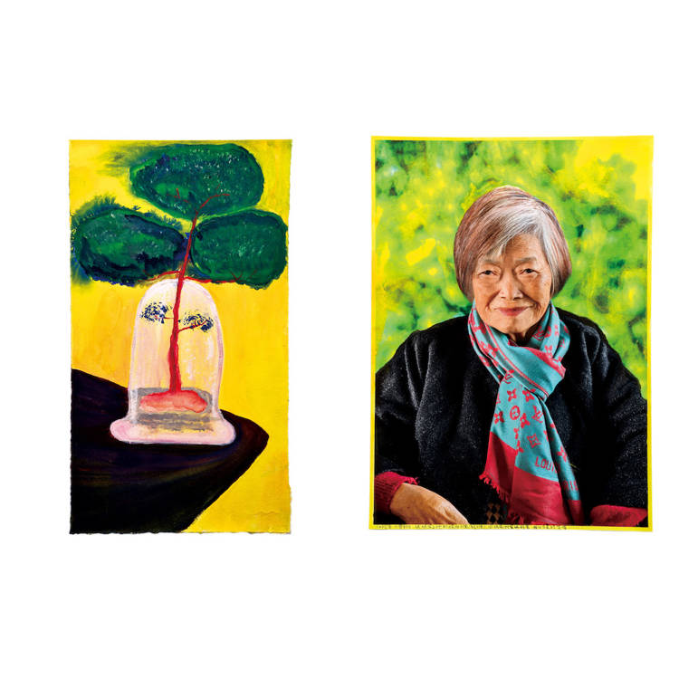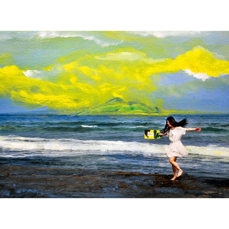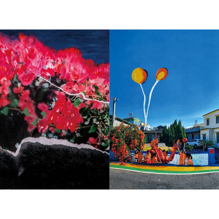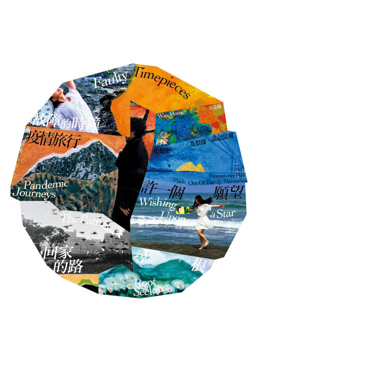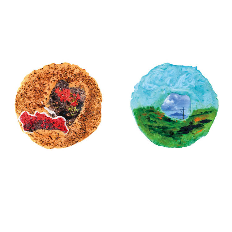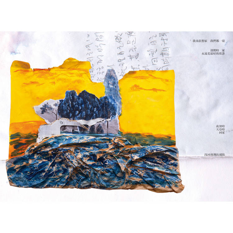 我的家鄉在大武山下,高屏溪穿越平原,流向大海,這樣的大地風景滋養著我。2020年後因疫情限制了人們的移動,我透過紙上旅行,思考著自己與外在環境的關係,當我以為可以在沒有邊界的國度中漫遊時,卻意識到自己正朝著家的方向走,尋找自己生命的起點。祖父母、父母、弟弟們與家鄉,組成了我對家的記憶:熱情的、溫暖的南國。我的作品常有山、河、海、島嶼、石頭等自然元素,因為自然總是包容、接納一切,包含曾經遠走的自己,穿梭在城市間、尋找家鄉的自己。透過創作,我成了一位輕巧的旅人,沿途蒐集記憶與畫面,放進保鮮盒裡等待發酵。旅途中所拍攝的,經過畫筆塗抹、紙張拼貼後,成了一個個的影像甜派,包裹著不滅的夢。