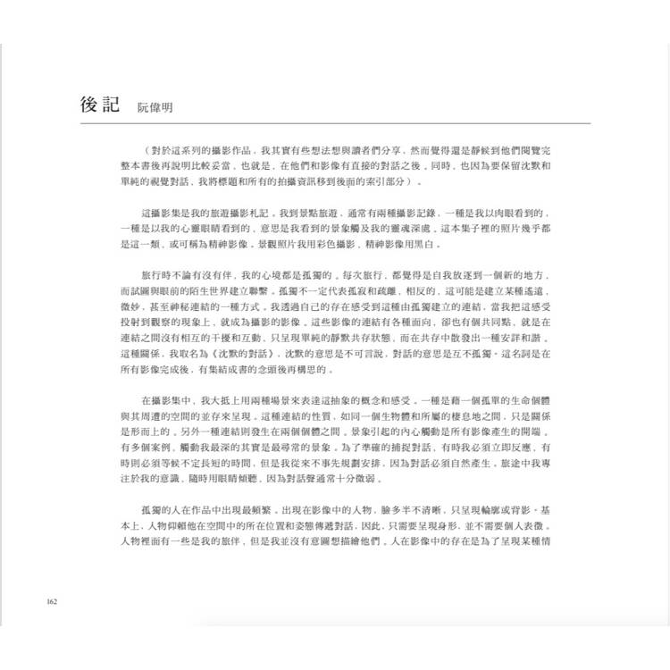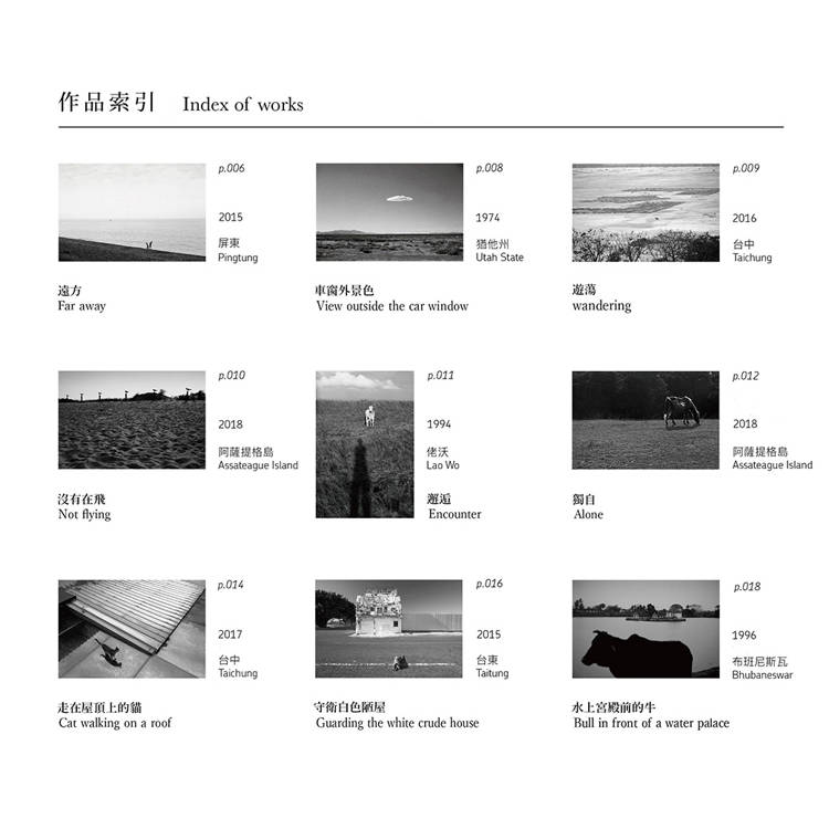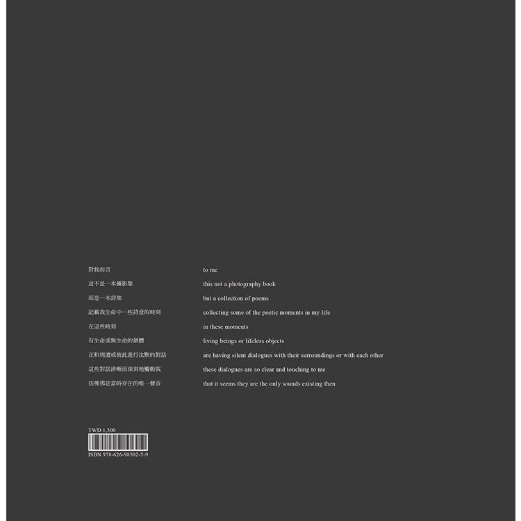 這本黑白攝影集拍攝的時間跨越四十五年,主旨在收集我人生中所經驗的詩意時刻。內容是以影像紀錄一種情境,這情境呈現的是生命個體和周遭之間的連結。生命個體除了人之外,也包含其他的物件,如動物。周遭是指周圍的空間環境或另一個體。所要表達的連結特質是一種若有若無,寧靜而悠遠的對話狀態。