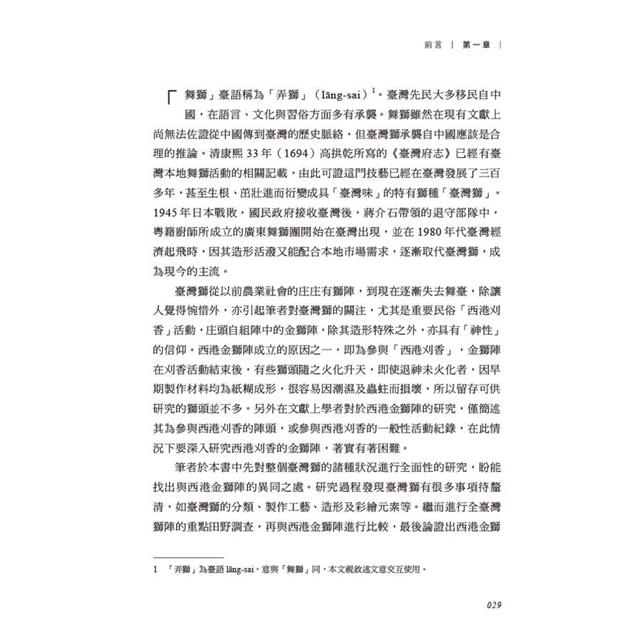 「臺語」雖來自「閩南語」,但經過長時間的衍變,臺語已自成一格。舞獅亦然,臺灣漢族先民大多由中國閩粵等地移民而來,合理推斷「臺灣獅」亦是傳承自中國,但,如語言一樣,舞獅在臺灣經過長期的蛻變,早已在地化為「臺灣獅」。臺灣獅在早期農業社會時,曾經叱吒臺灣各鄉鎮,幾乎是庄庄有獅陣,甚且還有一些地方被稱為「獅窟」( sai-khut),而這項傳統的表演藝術,在時代變遷下,正逐漸的凋零,因而引起筆者的關注。本書主要探討與臺灣獅相關的信仰、獅頭製作及「西港刈香」中,頗受關注的「西港獅」在臺灣獅中的定位、神性、特徵、分佈及溯源。