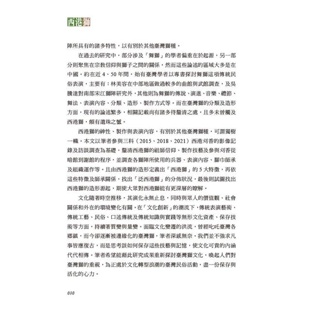 本文回顧了臺灣獅的發展歷程,從其在臺灣的起源到不同時期的演變。隨著時代變遷,廣東舞獅漸漸取代臺灣獅成為主流。除了將臺灣獅分門別類,也介紹了獅頭製作的工藝以及藝術。而後進而介紹西港刈香,並分析西港獅的特殊性,不僅是外在的特殊性,在刈香過程中也被賦予神性,這些都凸顯出了西港獅的特色。