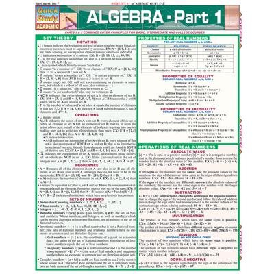 6 page laminated guide includes: Set Theory Properties of Real Numbers Operations of Real Numbers Algebraic Terms Steps for Solving a First-Degree Equation with One Variable Steps for Solving a First-Degree Inequality with One Variable Order of Operations Factoring Special Factoring Hints Rational Expressions Complex Fractions Synthetic Division Roots & Radicals Rational Expressions in Equations Radical Operations Radical Expressions in Equations Quadratic Equations Complex Numbers