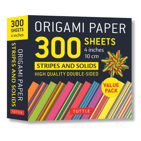 This pack contains 300 high-quality pieces of double-sided origami paper, printed with 12 different bright stripe patterns and vibrant solid colors. The fun colors of this paper were selected to enhance the creative work of origami artists and paper crafters. With prints unique to this package, there's enough paper here to assemble amazing modular origami sculptures, distribute to students for a class project, add to a scrapbook, or put to a multitude of other creative uses. This origami paper pack includes: 300 sheets of high-quality origami paper 12 colorful stripe designs and bright colors Small 4x4 inch (10cm) squares