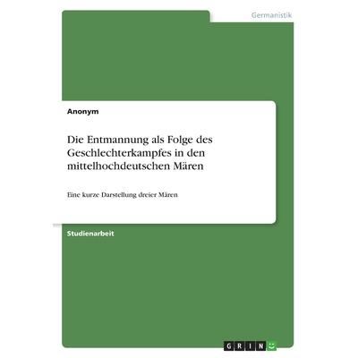 Studienarbeit aus dem Jahr 2017 im Fachbereich Germanistik - ?ltere Deutsche Literatur, Medi瓣vistik, Note: 1,7, Ludwig-Maximilians-Universit瓣t M羹nchen, Sprache: Deutsch, Abstract: In der Arbeit werden die drei M瓣ren "Die Rache des Ehemannes", "Das Nonnenturnier" und "Drei listige Frauen" hinsichtlich der Interaktion der Geschlechterrollen und der daraus resultierenden Entmannung analysiert. In diesem Kontext werden Frauenbilder, aber vor allem auch M瓣nnerbilder untersucht sowie die damit zusammenh瓣ngende Frage nach dem Machtanspruch der beiden Geschlechter. Es stellt sich die Frage: Wann ist ein Mann kein Mann mehr? Wie tr瓣gt die Frau dazu bei? Was bedeutet es, entmannt zu werden? Hierbei konzentriert sich die folgende Analyse auf die drastischste Form der Entmannung: das konkrete Abschneiden der m瓣nnlichen Geschlechtsteile. Die Umst瓣nde, unter welchen es zur Kastration kommt, m羹ssen gekl瓣rt werden und vor allem auch die Frage; wer kastriert wen? Schlussendlich sollen weitere m繹gliche Frage in diesem Zusammenhang gekl瓣rt werden, wie zu Beispiel: Ist die konkrete Entmannung nur noch das k繹rperlich sichtbare Resultat, der bereits zuvor auf der Herrschaftsebene stattgefundenen symbolischen Kastration? Dabei werden die Texte der mittelhochdeutschen M瓣ren, mit Hinblick auf die recherchierte wissenschaftliche Lekt羹re, auf Hinweise zur Beantwortung der aufgelisteten Fragen untersucht.