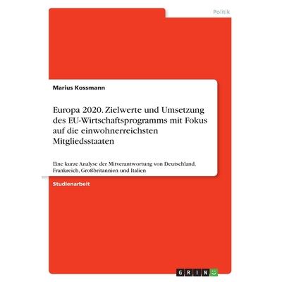 Studienarbeit aus dem Jahr 2020 im Fachbereich Politik - Klima- und Umweltpolitik, Note: 1,5, Hochschule Bremen (Gesellschaftswissenschaften), Veranstaltung: Europ瓣isierung der Verwaltung, Aktuelle Probleme der Europapolitik, Sprache: Deutsch, Abstract: Diese Ausarbeitung besch瓣ftigt sich mit der Europa 2020-Strategie, deren Ziele die Europ瓣ische Union nicht erreichen wird. Im Folgenden werden nur die vier einwohnerreichsten Mitgliedstaaten angeschaut. Diese sollen dar羹ber eine Erkenntnis liefern, ob das Verfehlen der Zielvorgaben europaweit ein Grund daf羹r ist, dass die gr繹?ten Mitglieder der Union diese selbst nicht umsetzen konnten. Es sich gr繹?tenteils die Frage, weshalb diese Ziele innerhalb von zw繹lf Jahren nicht erreicht werden konnten - zumal Kroatien, das erst 2013 der Union beigetreten ist, in einigen Berechnungen nicht ber羹cksichtig wurde und somit auch nur die Mitgliedsstaaten Zielvorgaben angegeben haben, die bereits bei der Initiierung der Strategie Mitglied waren. Es ist also ausgeschlossen, nur die Europ瓣ische Union in die alleinige Verantwortung zu ziehen, weil die gesetzten Ziele nicht erreicht wurden. Es muss also vielmehr analysiert werden, welche Mitgliedsstaaten eine deutliche Mitverantwortung an diesem Ergebnis tragen. Es wird also davon ausgegangen, da der Blick auf Deutschland, Frankreich, Gro?britannien und Italien gerichtet ist, dass das Verfehlen der europaweiten Ziele von der Umsetzung der vier einwohnerreichsten Staaten abh瓣ngt. Damit diese Annahme empirisch erarbeitet werden kann, wird folglich verst瓣ndnishalber die Europa 2020-Strategie erl瓣utert und deren aktuellen Ergebnisse im Hinblick auf die Pressemitteilung vom Oktober 2019. Deshalb werden die vier einwohnerreichsten Mitgliedsstaaten einzeln analysiert und weitestgehend tabellarisch verglichen. Schlussfolgernd soll im Fazit die Annahme anhand der empirischen Betrachtung diskutiert werden.