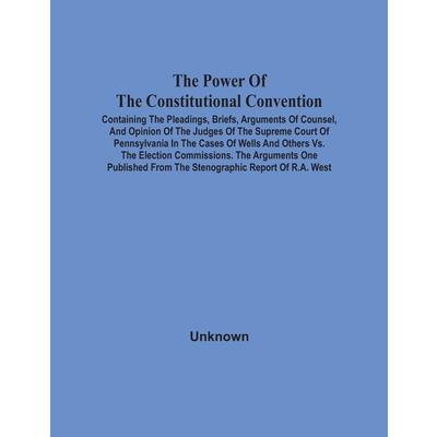 The book, The Power Of The Constitutional Convention, Containing The Pleadings, Briefs, Arguments Of Counsel, And Opinion Of The Judges Of The Supreme Court Of Pennsylvania In The Cases Of Wells And Others Vs. The Election Commissions. The Arguments One Published From The Stenographic Report Of R.A. West, has been considered by academicians and scholars of great significance and value to literature. This forms a part of the knowledge base for future generations. So that the book is never forgotten we have represented this book in a print format as the same form as it was originally first published. Hence any marks or annotations seen are left intentionally to preserve its true nature.