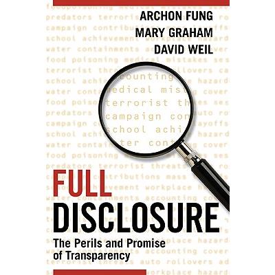 Which SUVs are most likely to rollover? What cities have the unhealthiest drinking water? Which factories are the most dangerous polluters? What cereals are the most nutritious? In recent decades, governments have sought to provide answers to such critical questions through public disclosure to force manufacturers, water authorities, and others to improve their products and practices. Corporate financial disclosure, nutritional labels, and school report cards are examples of such targeted transparency policies. At best, they create a light-handed approach to governance that improves markets, enriches public discourse, and empowers citizens. But such policies are frequently ineffective or counterproductive. Based on an analysis of eighteen U.S. and international policies, Full Disclosure shows that information is often incomplete, incomprehensible, or irrelevant to consumers, investors, workers, and community residents. To be successful, transparency policies must be accurate, keep ahead of disclosers' efforts to find loopholes, and, above all, focus on the needs of ordinary citizens.