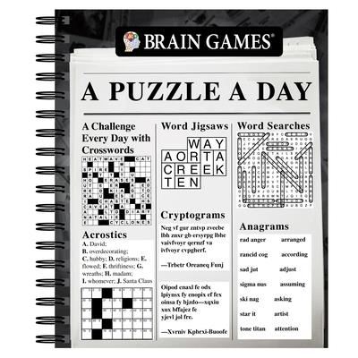 Brain Games A Puzzle a Day is a throwback to newspaper puzzle sections of yesteryear!A fun shuffle of puzzles that features up to 4 puzzles on a single page.The 366-puzzle count lends itself well to use as a daily routine starter or nighttime wind down activity.Puzzle varieties include: crosswords, acrostics, word jigsaws, cryptograms, sudoku, word searches, anagrams, and more!Spiral binding allows the book to lie flat while in use.192 pages