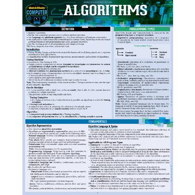 6 page laminated guide includes: Defining Computer AlgorithmsFormalizationProgramming TypesAlgorithm FundamentalsAlgorithm RepresentationAlgorithm Language & SyntaxProcess StateLogical StateProcess CommunicationAlgorithm ClassificationDesign ParadigmsProcess TypeDesign Paradigms Brute ForceIterativeRecursive/Recursion TypesDivide & ConquerEnumeration, Search & SortBacktrackingGraphBranch & BoundGreedy MethodHeuristic MethodsRandomizedGenetic (Evolutionary Computation)Geometric