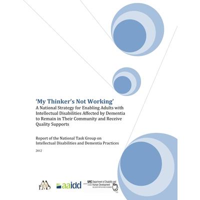 'My Thinker's Not Working': A National Strategy for Enabling Adults with Intellectual Disabilities Affected by Dementia to Remain in Their Community and Receive Quality Supports, prepared by the National Task Group on Intellectual Disabilities and Dementia Practices, provides a summary of the challenges facing the nation as we observe an increasing rate of dementia found in older people with intellectual disabilities. The Report offers recommendations for the various stakeholders in the field of intellectual disabilities and anticipates that its findings and recommendations will be considered and integrated into the annual reports and plans developed by the federal Advisory Council on Alzheimer‟s Research, Care, and Services.