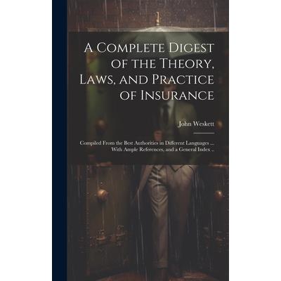 A Complete Digest of the Theory, Laws, and Practice of Insurance is a comprehensive guide to the insurance industry written by John Weskett in the mid-19th century. The book covers topics ranging from the calculation of premiums to the interpretation of legal contract language, and provides extensive reference materials for further exploration.