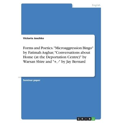 Seminar paper from the year 2023 in the subject English Language and Literature Studies - Literature, grade: 1,3, language: English, abstract: This Essay will be about the poems "Microaggression Bingo" by Fatimah Asghar, "Conversations about Home (at the Deportation Centre)" by Warsan Shire, and "+, -" by Jay Bernard and why it belongs to contemporary BIPoC poetry. To achieve this goal, firstly, the concept of BIPoC poetry is to be clarified. Secondly, each poem will be looked at individually to see if the poems just mentioned meet the criteria to be considered as such. In this essay, the differences and similarities of the poems are worked out and a critical reflection on to the extent to which the poems are considered experimental and/or contemporary follows. While the poems will be closely examined and shed light onto, attention will also be given to the aspects of representation of othering, exclusion, and discrimination and to what extent these three works illustrate the experiences of their respective narrator. Fatima Asghar's "Microaggression Bingo" exposes the subtle, everyday acts of racism and microaggression experienced by marginalized individuals. The poem uses the format of a bingo game to highlight the pervasive nature of these encounters, illustrating the emotional toll they take on the individual. In "Conversations about Home (at the Deportation Centre)" by Warsan Shire, the poet delves into the experiences of immigrants detained in deportation centers, focusing on the themes of displacement, loss, and longing for a sense of belonging. The poem explores the complex emotions and stories of individuals forced to leave their homes and navigate a system that dehumanizes them. Through vivid imagery and poignant lines, Shire invites readers to empathize with the struggles faced by immigrants and question the concept of 'home'. The third poem "+, -" by Jay Bernard reflects on the New Cross house fire tragedy, a devastating event that occurred in London