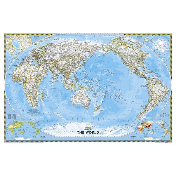 Product Features: Signature Classic style map with bright, easy to read color palette with blue oceans and colorful bordersUnique Pacific-centered view accentuates the Pacific Rim and focuses on Asia, Oceania, and the full breadth of the Pacific Ocean. Background shows mountain ranges and valleys in subtle shaded relief with mountain ranges labeled Major water bodies including rivers, lakes, glaciers, oceans, seas, gulfs, bays, straits, and bathymetryClearly defined international boundaries, cities, islands, airports, and physical featuresThousands of place names carefully and artfully placed to maintain legibility in heavily populated areasUp-to-date international boundaries and territorial control reflect de facto status on the groundMeticulously researched using multiple authoritative sources including the U.N., U.S. Board on Geographic Names, and policies of individual governments.Accurate place names use a combination of conventional English names, official national names, and standard transliterations for non-Latin alphabets. Drawn in Winkel Tripel projection with distortions minimized unlike other World maps (e.g. Greenland is shown the same size as Argentina, not South America)Corner inset maps feature vegetation, land use, population density, and north and south polar regions