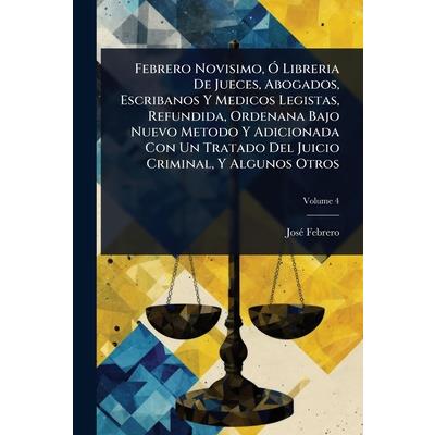 "Febrero Novisimo, ?" Libreria De Jueces, Abogados, Escribanos Y Medicos Legistas, Refundida, Ordenana Bajo Nuevo Metodo Y Adicionada Con Un Tratado Del Juicio Criminal, Y Algunos Otros, Volume 4" is a comprehensive legal text intended for judges, lawyers, scribes, and legal medical professionals. Refunded and reorganized under a new method, it includes additions such as a treatise on criminal proceedings. This volume offers insights into 19th-century legal practices and thought, reflecting the period's approach to justice and legal scholarship. A valuable resource for those studying legal history and the evolution of legal systems.