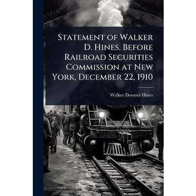 This is the Statement of Walker D. Hines, presented before the Railroad Securities Commission in New York on December 22, 1910. Walker Downer Hines (1870-1934) was a prominent American lawyer and railroad executive. He served as Director General of Railroads during World War I and later as president of the New York Cotton Exchange.