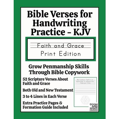 Each of these simply-designed Scripture verse sheet features a King James Bible verse and reference to copy onto properly sized lined and dashed paper. Verse sheets also include a fun maze! There are some additional practice pages and a letter formation guide at the back of the book.52 Scripture verses about faith and graceVerses from both Old and New TestamentsThree to four lines per verseLined and dashed area for copying (1/2" ruling)Additional practice sheets