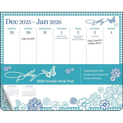Adding just the right touch of Dolly to home or office, the Dolly Parton 2026 Weekly Desk Pad keeps organization light and breezy. Like the lady says, sometimes the grass is blue. The Dolly Parton 2026 Weekly Desk Pad's cool cornflower and teal tones prove even a Backwoods Barbie can't always wear pink. Doing double-duty as a computer mousepad, it looks great while you're workin' nine to five. Features include: Weekly desk pad can also be used as a computer mouse pad 9" x 7.25" FSC(R) certified paper with soy-based ink Color tear-off weekly pages Spans January-December 2026 Generous space for noting tasks, appointments, planning meals, tracking habits, etc. Official major world holidays and observances Distinctive Dolly-inspired artwork on each page