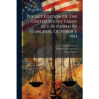 This is a pocket edition of the United States Tariff Act as passed by Congress on October 3, 1913, together with a schedule of articles revised to January 1, 1914. It includes the rate of duty and paragraph of law for each article. Compiled by F.B. Vandegrift & Co. and William Watson Rich, this edition offers a comprehensive reference to the tariff regulations in effect during the early 20th century.