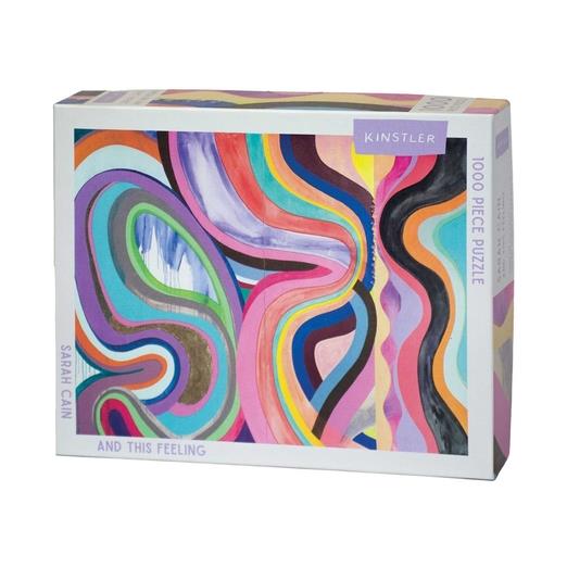 A colorful 1000 piece puzzle featuring the artwork of acclaimed Los Angeles based artist Sarah Cain. 1000 piece puzzle featuring the artwork of Sarah Cain. Sarah Cain brings rooms to life with experiments in color, composition, and non-conformity. Cain modifies canvases by cutting, sewing, and attaching found objects. She also paints floors, walls, and furniture on-site, grounding each space she occupies in the present tense. Her process of creation and destruction is steeped in the history of painting and feminist art practices. and this feeling (2023), incorporates sand and prisms to add a touch of found-object energy to planes of pure color and are typical of Cain's boundless approach to art.