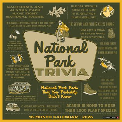 TRAVELER TRIVIA: Learn over 300 national park facts that you probably didn't know and test your knowledge with the 2026 National Park Trivia 12" x 12" Wall Calendar. See why these treasured, protected lands have amazed and enchanted visitors for generations. Whether on your way to the towering peaks of Zion, the dizzying depths of the Grand Canyon, or are simply daydreaming about your next adventure, this calendar is a compilation of the best "Did you know..." tips, tidbits, and fascinating facts.