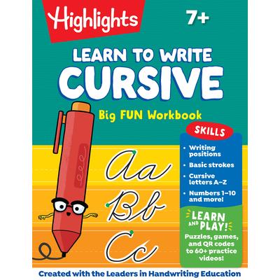 Turn cursive practice into a skill kids are proud of with the handwriting workbook developed with Zaner-Bloser and paired with exclusive digital video tutorials. Step-by-step instructions, 110+ pages of practice, and Highlights' signature puzzles make this the most engaging way to learn beautiful, confident cursive. Learning cursive doesn't have to feel like a chore. Learn to Write Cursive Big Fun Workbook combines Zaner-Bloser's gold-standard handwriting instruction with Highlights' trademark blend of puzzles, humor, and encouragement--plus access to digital video tutorials that model every stroke and connection. Kids ages 7 and up start with clear, guided letter formation, then progress to connecting letters into words and sentences, all while solving puzzles and enjoying colorful art that keeps them motivated. With 110+ pages plus progress checkpoints, free-writing space, and activities that boost visual perception and fine motor skills, it's a comprehensive, screen-free tool for home or classroom use.