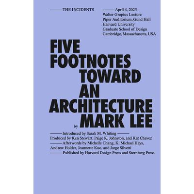 Architect Mark Lee presents a body of work on the basis of five considerations: on history, on cadence, on autonomy, on America, and on point. On the occasion of his fifth and final year as Chair of the Department of Architecture at the Harvard University Graduate School of Design, architect and educator Mark Lee strings together five "footnotes"--on history, on cadence, on autonomy, on America, and on point--to assess the relationship between architectural education, research, and professional practice. Evoking a similar position that marked his tenure, Lee delivers a lecture that embraces dialogue, context, and precedent, and rejects the notion of a heroic manifesto in favor of the footnote: "something ancillary, something used for referencing and providing citations for metanarratives that already exist." And why five? "It's a ubiquitous number in the culture of architecture. Five orders, five architects, five points." Copublished by Harvard Design Press