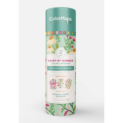 Create three beautiful paintings with this easy-to-use paint-by-number kit featuring colored-line patterns of inspiring floral designs! ColorMaps Paint-by-Number Relaxing Garden delivers amazing results with zero stress. Users simply match the paint to the colored line and number, and watch their canvas bloom to life. This kit includes three 11" x 17" rolled canvases with soothing messages and motifs to inspire mindfulness and relaxation: a vibrant butterfly design, a floral "RELAX" design, and a greenery-filled "LET IT GO" design--all printed with colored lines that guide every brushstroke and blend into the paint for a finished look that feels like an original. The kit comes with 12 paint pots (plenty of paint for all three canvases), two quality paintbrushes (one for wide coverage and one for fine detail), and a simple instruction leaflet. When the painting is done, users simply pop their art into the included magnetic wooden frame to display it, and swap in a new canvas whenever they want to refresh their mini gallery.