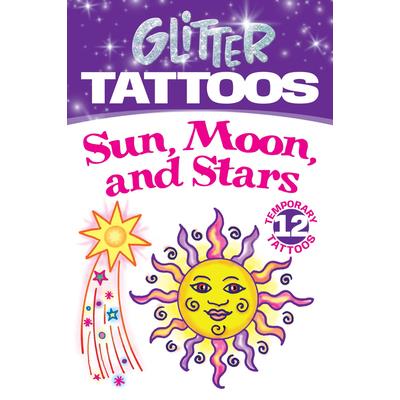 A celestial array, featuring a dozen sparkling tattoos! From the first light of dawn till long after dark, these glittering tattoos will shine brightly. Twelve heavenly images include rising suns, snoozing moons, and twinkling stars. A dash of glitter lends extra dazzle to each tattoo.