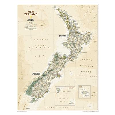 The reference map of New Zealand uses Expertly researched and designed, National Geographic's Executive style with an antique-style color palette and stunning shaded relief. The map shows this island nation in great detail, from the subtropical North Island (Te Ika-a-Maui) to the glacial carved valleys of Fiordland on the South Island (Te Waipounamu). The North Island is best known for large volcanic lakes and the cities of Auckland and Wellington. The South Island is famous for the Southern Alps that run along the spine of the island. The highest point in the country is Aoraki (Mount Cook) and is found in the Southern Alps.