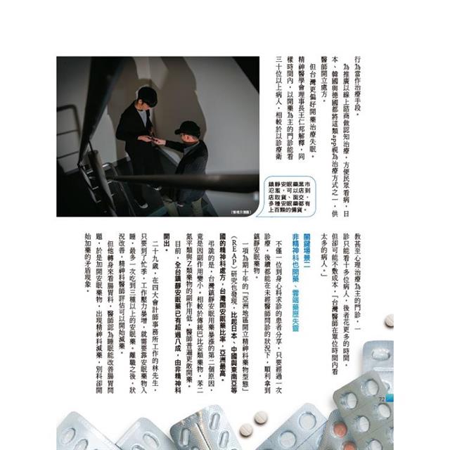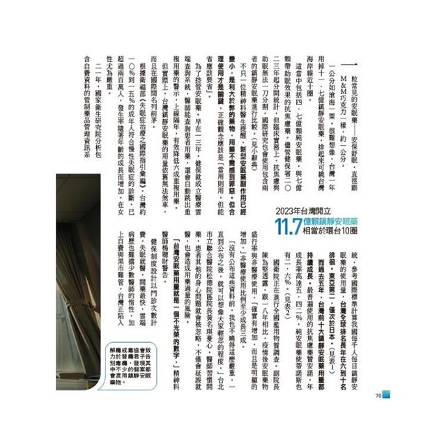 但健保制度設計,使失眠治療等於開立鎮靜安眠藥。近年副作用降低,醫生更敢開,台灣每年吃十一.七億顆鎮靜安眠藥,連起來竟可繞台灣十圈。(見68頁)
