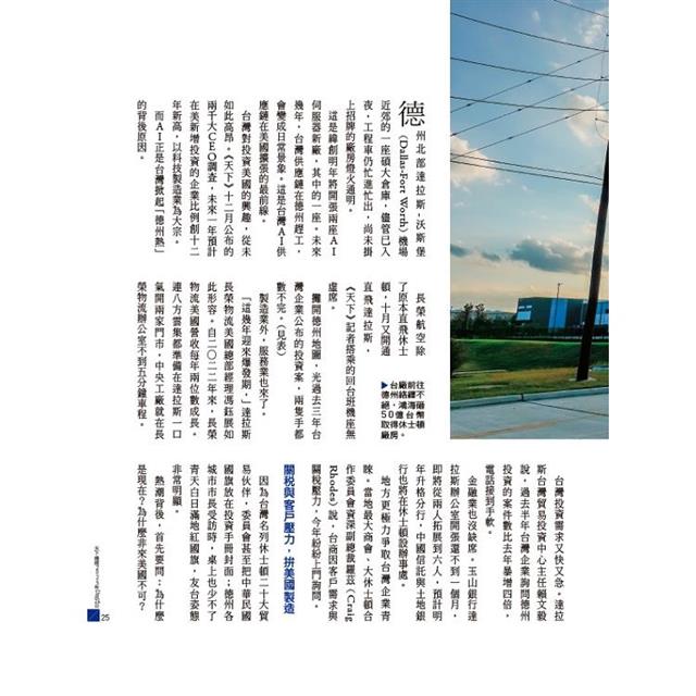 最後,推薦兩篇國際報導。一篇是台商在德州的最新紀實(見24頁);另一篇則是《天下》歐洲特派沈朋達發自巴黎的觀察(見122頁)。面對川普改變的全球新秩序,歐洲跟台灣一樣,重視二○二七這個時間點。台灣長期依賴美國,但不必諱言,跟二十世紀比,美國是控制力正在減弱的強權;歐洲是台灣不能忽略的伙伴。沈朋達將從法國持續送回歐洲觀察,敬請關注。