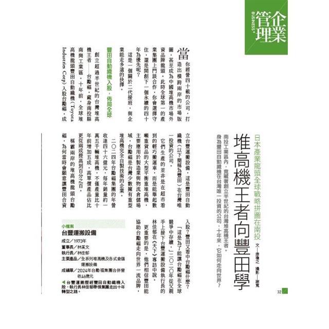 另外推薦,台豐運搬的大股東,是豐田集團的起源公司豐田自動織機。去過名古屋豐田博物館的人,對大廳裡展示的織布機應該印象深刻。這家已傳承四代的公司,經歷數次轉型,早已不只賣織布機。審時度勢,因勢利導,天道酬勤,百年企業的韌性莫過於此。(見32頁)