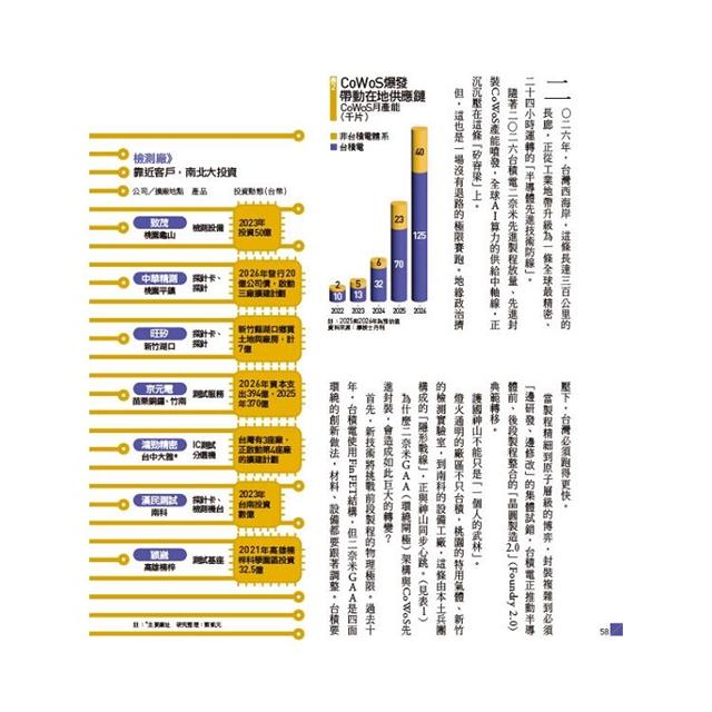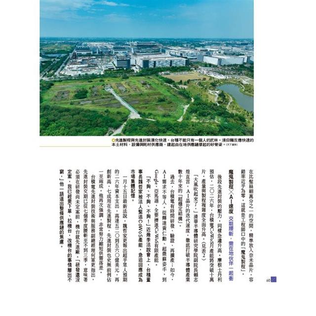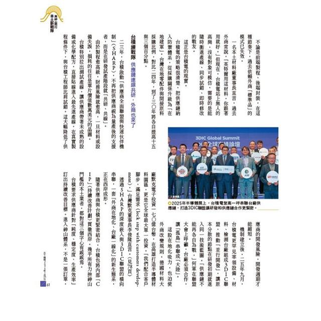 《天下》資深主筆黃亦筠、資深撰述鄧凱元、資深記者林以璿形容,台積打造的先進製程與封裝供應鏈,已經從一個人的武林,變成了一群人築成的台灣防線。(見56頁)