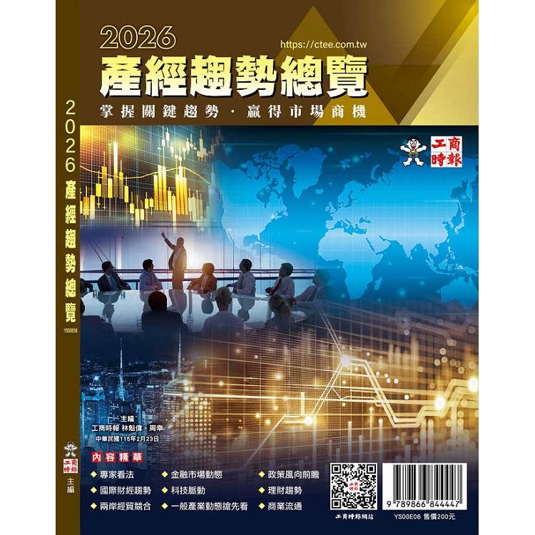 《2026產經趨勢總覽》是工商時報年度最新力作,預定將於2026年2月23日出版,匯聚了台灣最專業的財經記者採訪群,精心策畫,以專題報導方式,針對2026年國際經濟情勢、國內財經金融政策、兩岸經貿競合、證券保險、稅務稅法、個人理財趨勢、基金投資商機、科技脈動、及產業展望等各個面向,以第一手的觀察和解析,提供政府相關單位、企業界經營者、一般投資大眾,一個明確的經營方針及投資理財參考。工商時報創刊於1978年,過去47年來,秉持身為台灣重要財經媒體之一,以專業角度搶先報導目前國際財經新聞、最新的科技創新與產業市場動態,以期提供最多資訊給企業經營者及投資大眾。