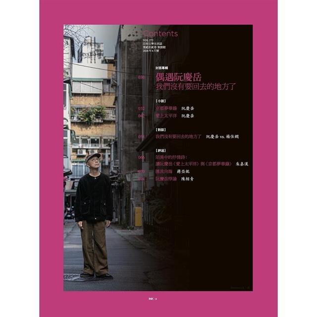 本期封面專輯「偶遇阮慶岳:我們沒有要回去的地方了」,收錄全新小說〈京都夢華錄〉與〈愛上太平洋〉。隨著人物在京都與台東之間流轉,不急於抵達,而是在途中反覆探尋停靠的片刻。當我們不再執著於歸屬,便隨感官而行,在一次次的偶遇裡,游移其間。
