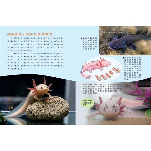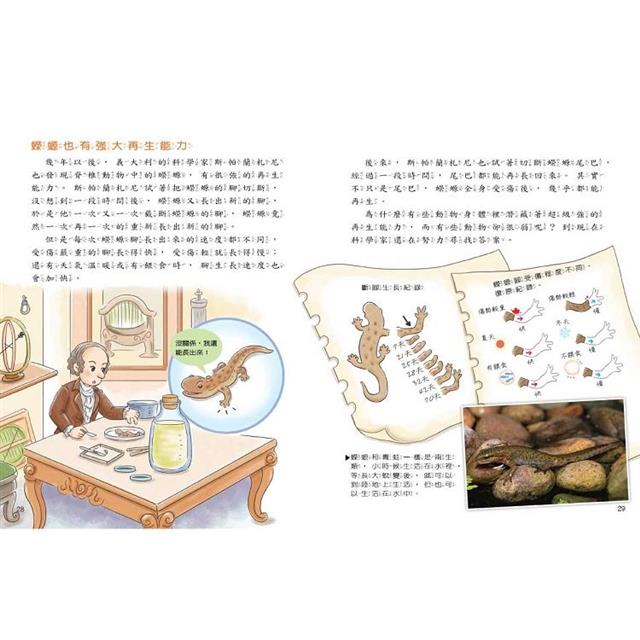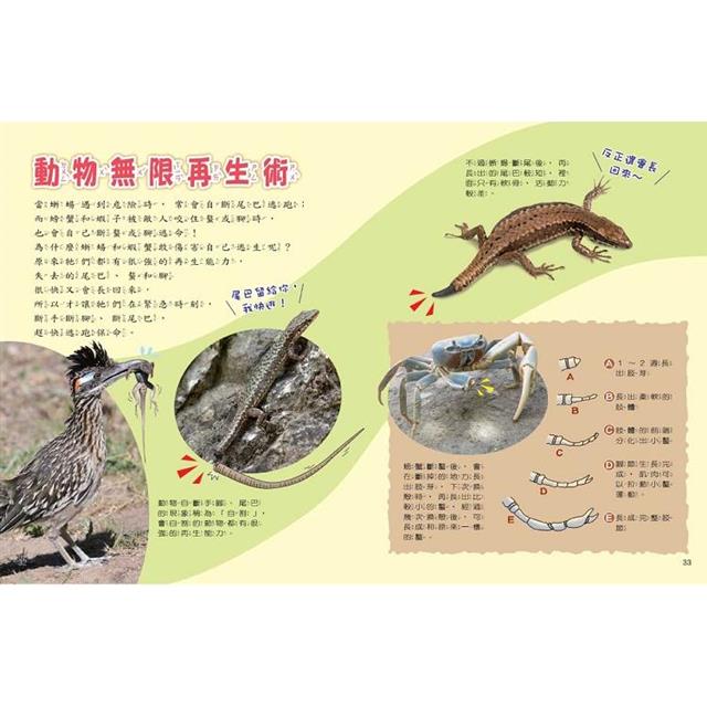 蜥蜴、螃蟹、蝦子遇到危險時,常會自斷尾巴、螯或腳逃命去,這些生物會採用這種自我傷害的方式來保命,是因為牠們具有很強的再生能力,這些失去的部分經過一段時間,都可以再長回來,所以和性命相比,捨棄這些部分一點也不可惜。到底哪些動物有再生能力?牠們又利用再生能力,表現出哪些生存絕招呢?快跟著阿思克和Eyebox一起去看看吧!