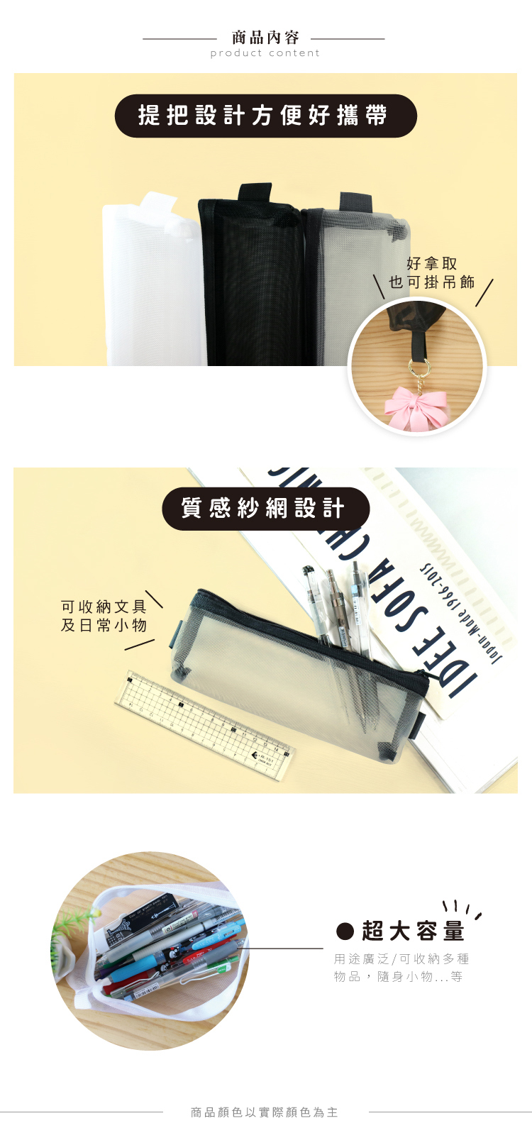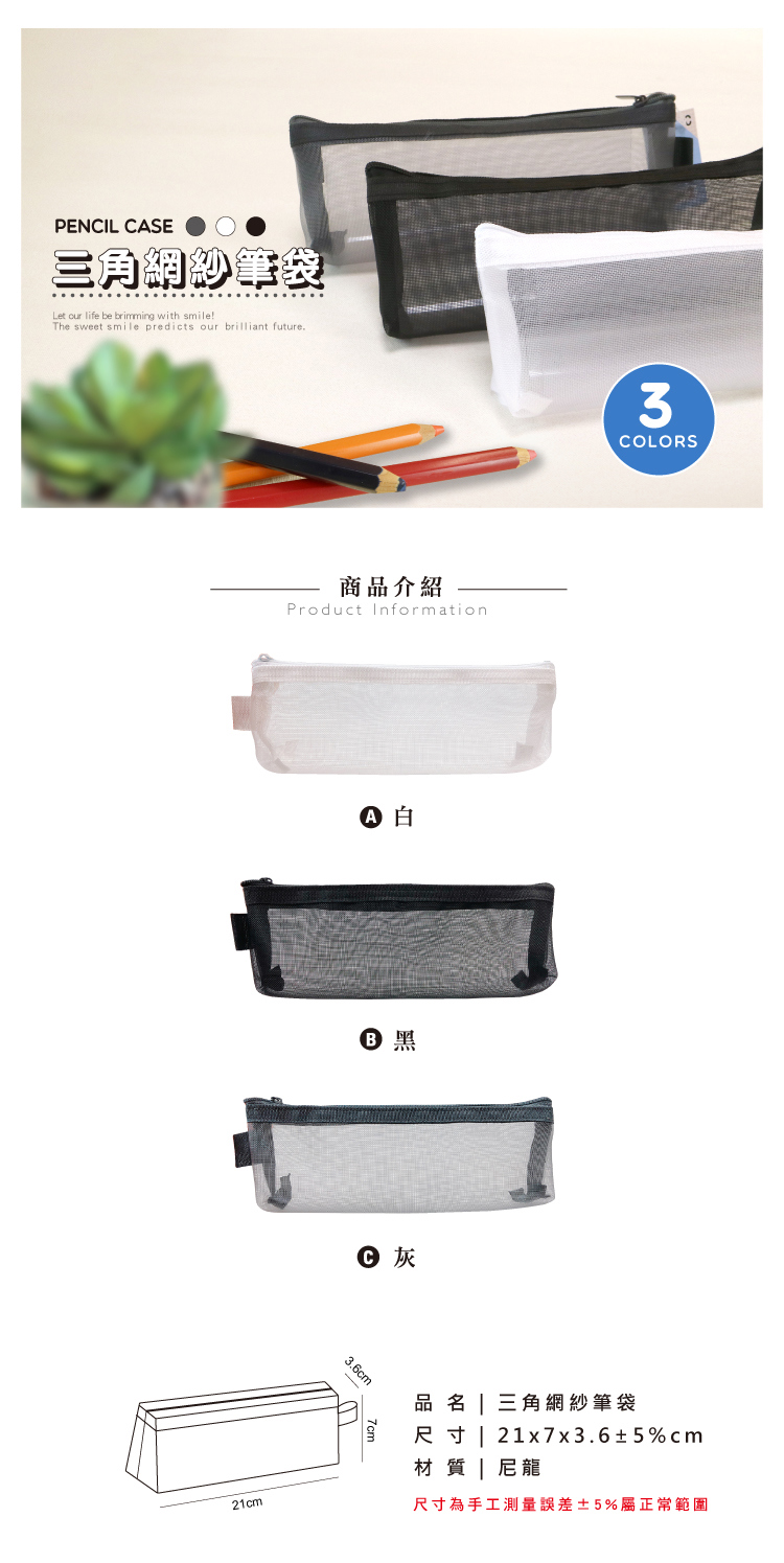 【商品說明】 1. 青青 簡單生活系列 CPC-170 三角網紗筆袋(210X70X36mm ±5% ) 2. 質感網紗設計,共三色可選 3. 數量:1入/材質:尼龍 4. 超大容量,可收納多種物品及隨身小物...等