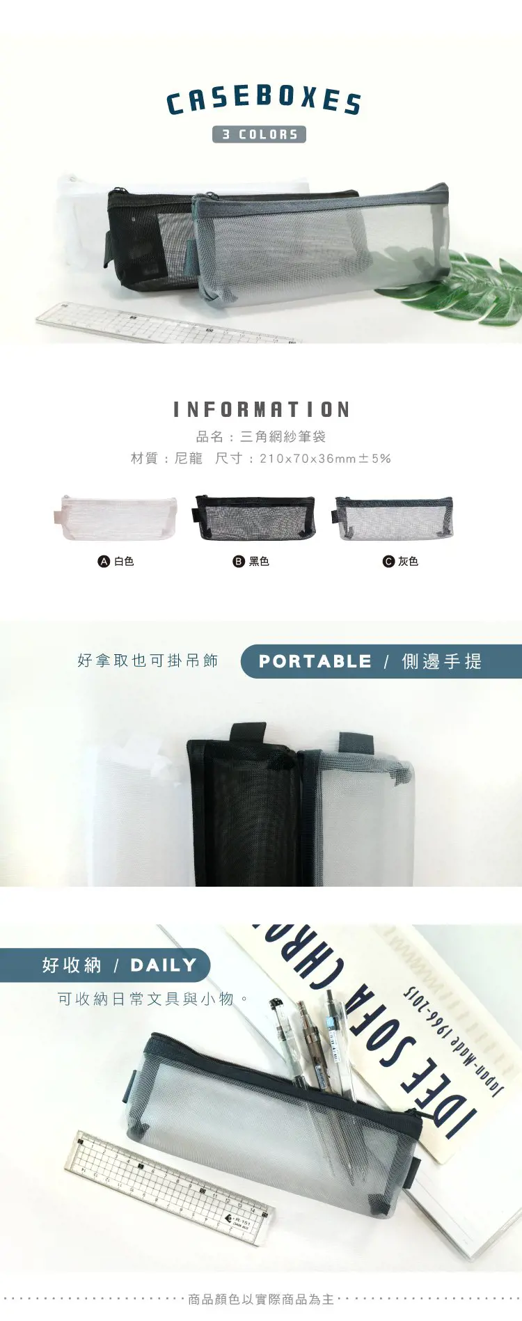 【商品說明】 1. 青青 簡單生活系列 CPC-183 三角網紗筆袋(210X70X36mm±5%) 2. 質感網紗設計,共三色可選 3. 數量1入/材質:尼龍 4. 超大容量,可收納多種物品及隨身小物...等