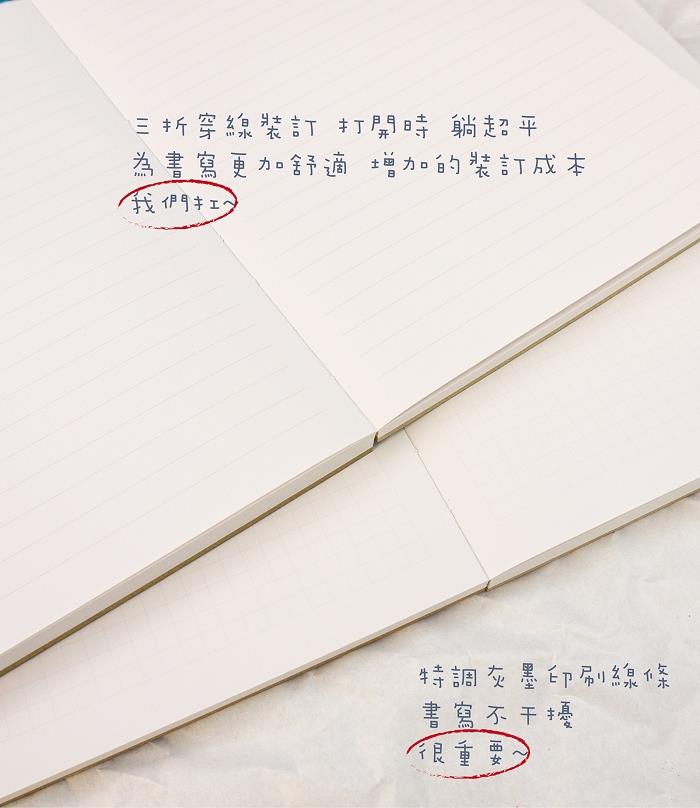 ★三折穿線裝訂 打開時 躺超平 為書寫更加舒適 增加的裝訂成本 我們扛~