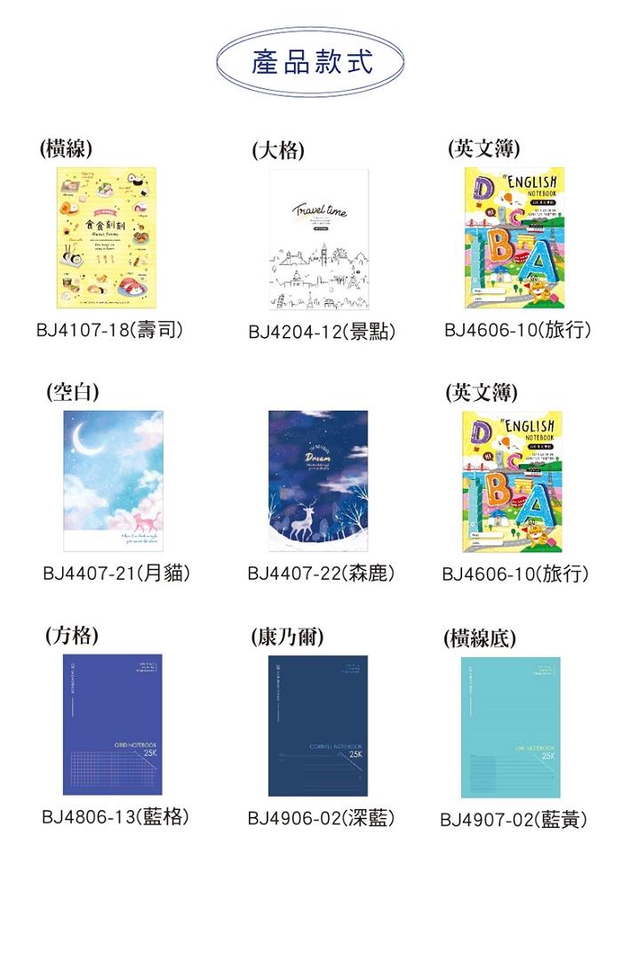 § 內頁有橫線、大格、空白、英文簿、方格、康乃爾、橫線底等款式。