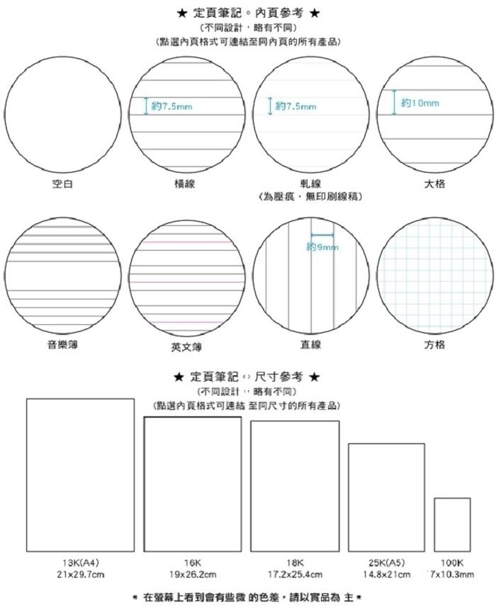 § 內頁有橫線、大格、空白、英文簿、方格、康乃爾、橫線底等款式。