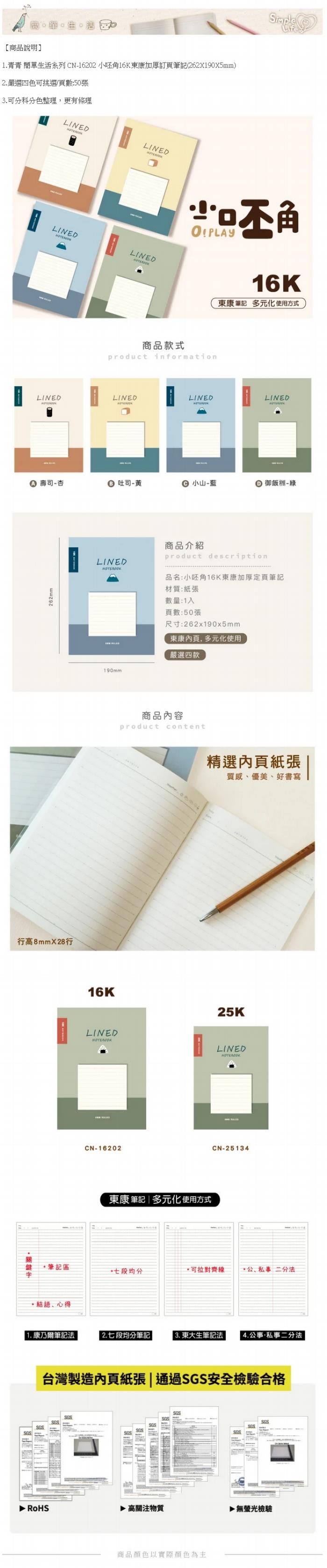 ◎青青 簡單生活系列 CN-16202 小呸角16K東康加厚訂頁筆記(262X190X5mm)