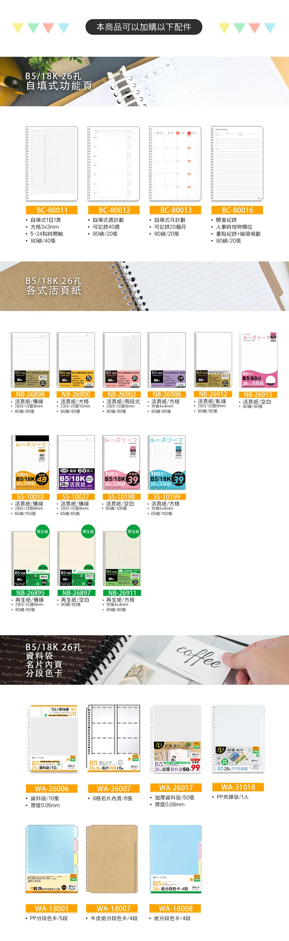 - 可搭配本店B5/18K 26孔活頁紙使用
