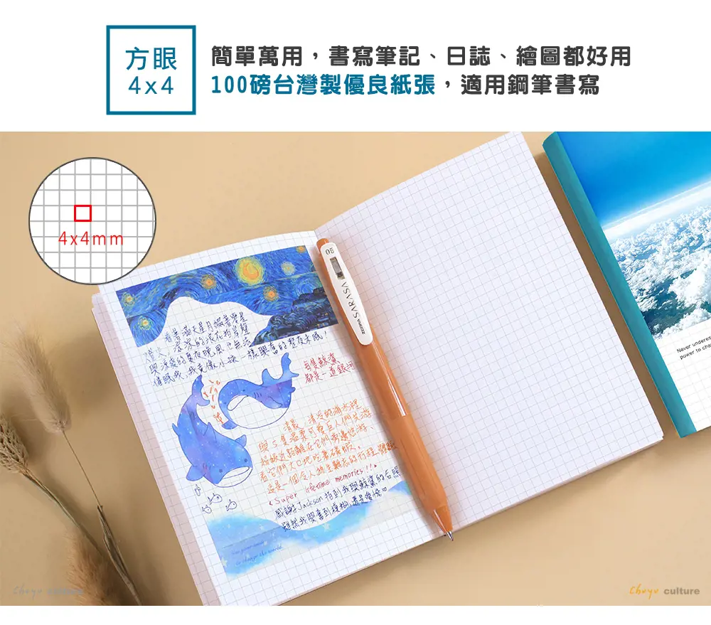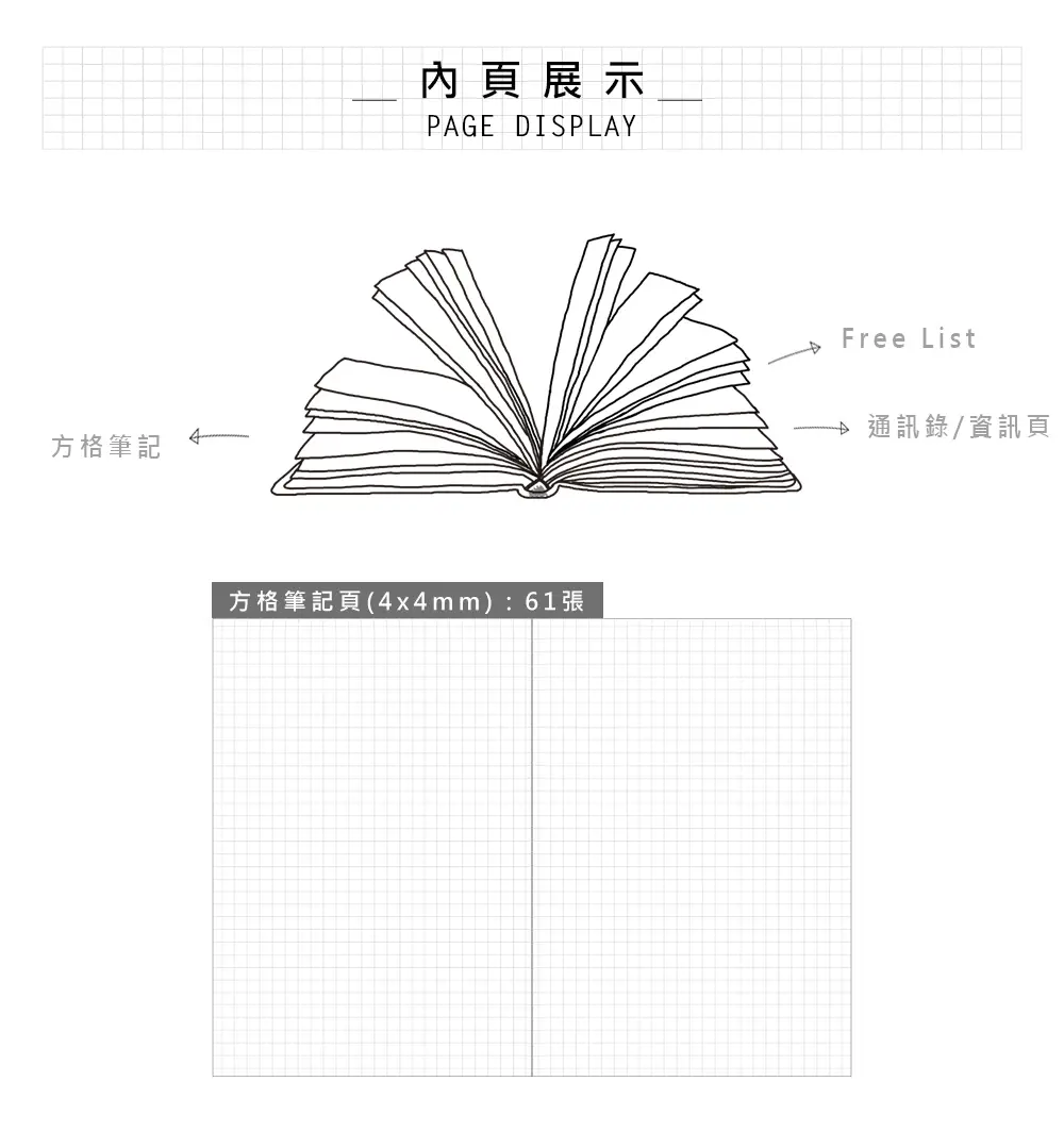 • 方格4x4mm,簡單萬用,寫筆記、日誌、繪圖都好用