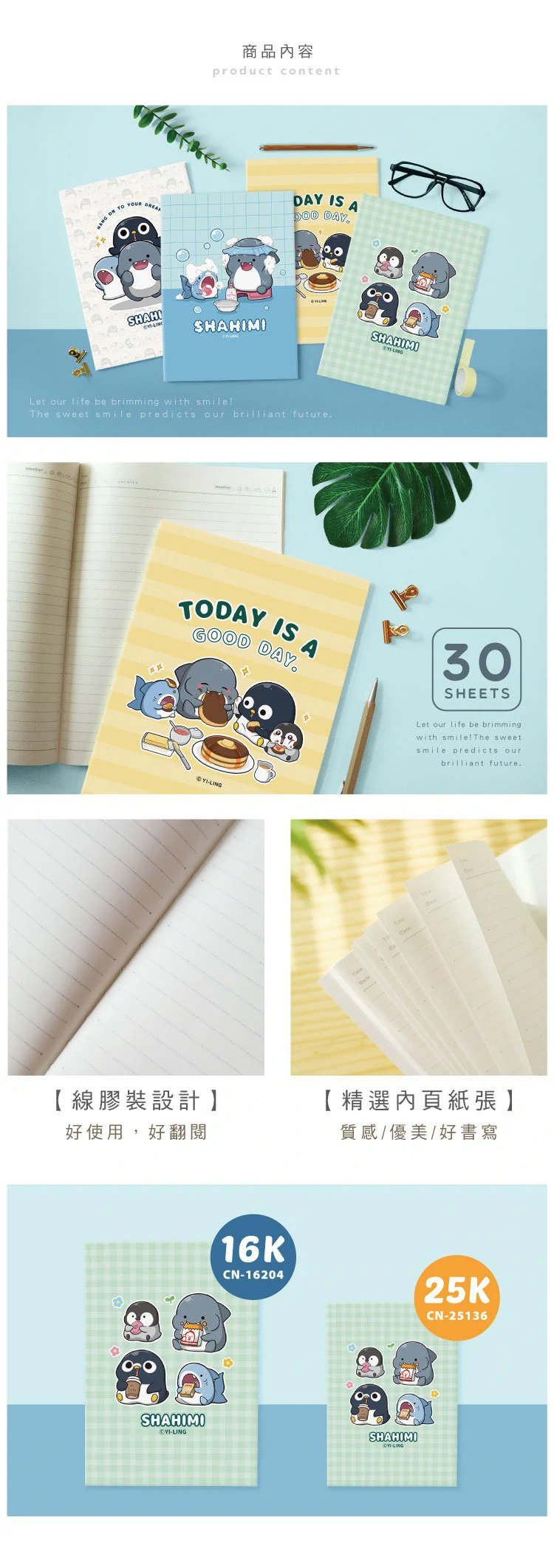 ◎內頁30張入【商品說明】  1.青青 鯊西米系列 CN-16204 16K東康定頁筆記(262x190x3mm)